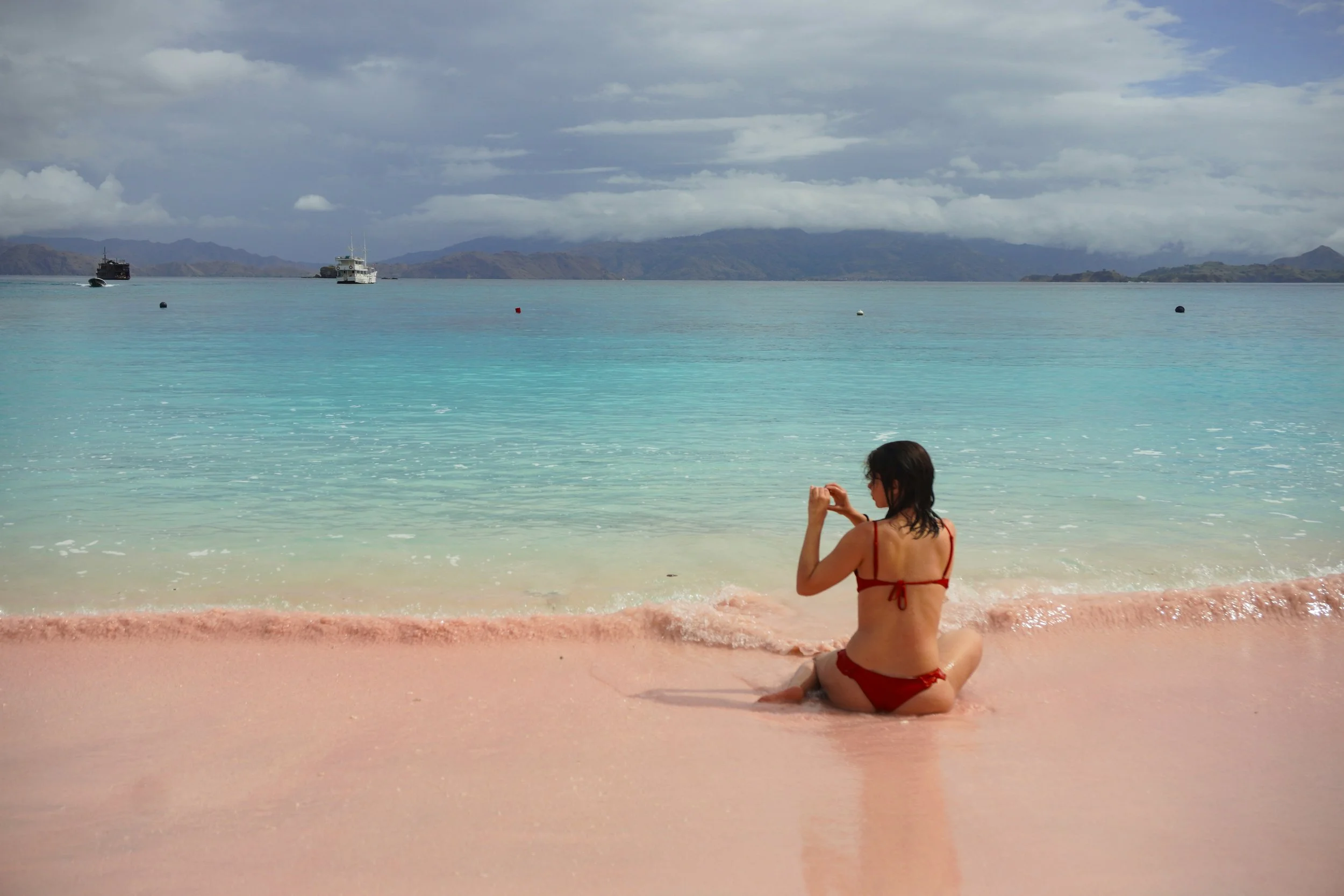 As the storm approached, our descent turned out to be much quicker than the climb up. We then continued towards Pink Beach, on the northern side of Padar. Luckily, the storm passed and for a brief moment even the sun came out. Along the shore, the beach glowed in a soft pink tone, created by the mixing of crushed red coral fragments with white sand. Fewer than ten natural pink beaches exist in the world, and Komodo National Park is home to one of them.