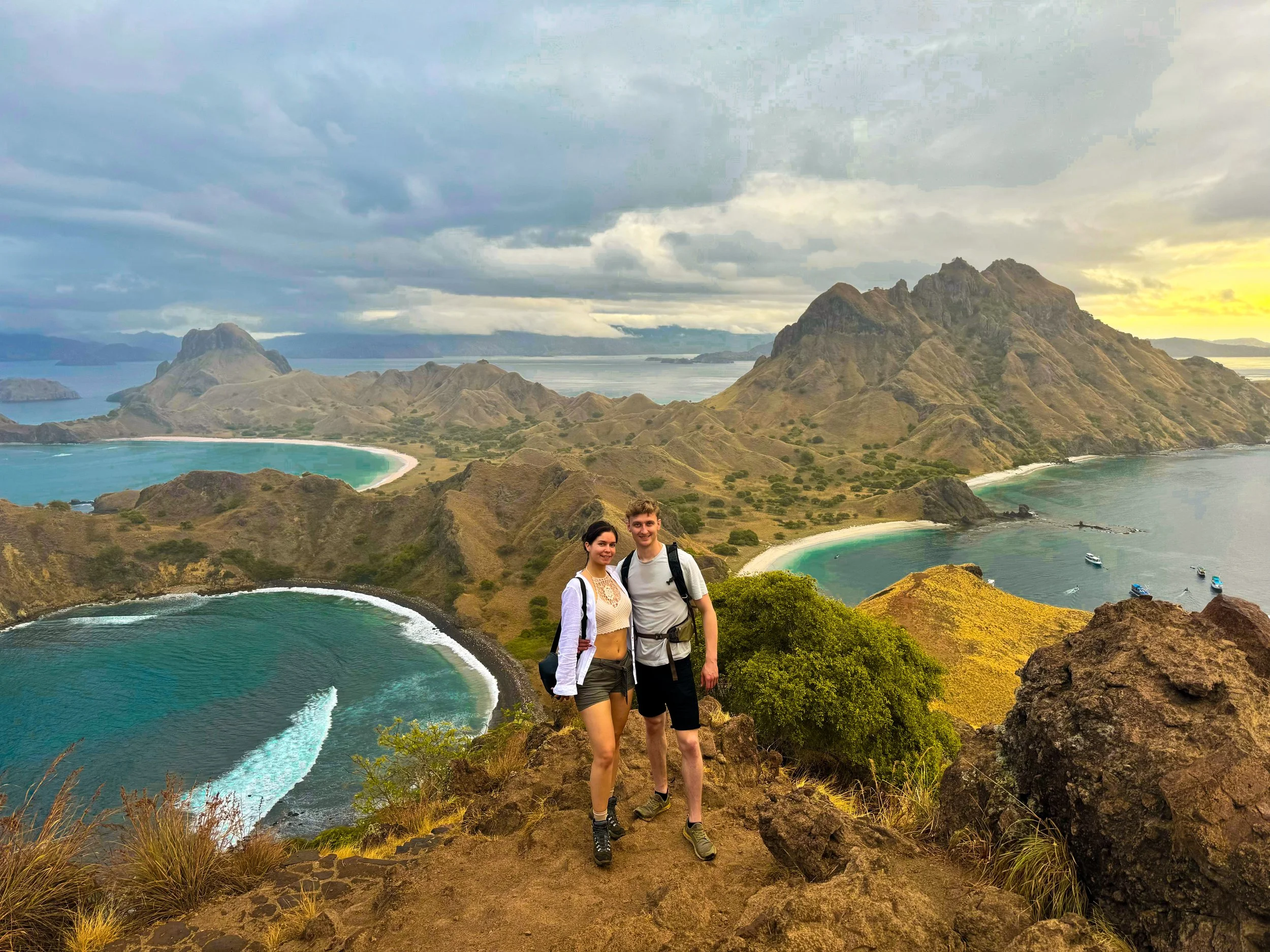 The next morning, we woke up at five. After a light breakfast, we started the climb to Padar’s famous viewpoint, which takes around 40 to 60 minutes depending on your pace. To our disappointment, the morning was cloudy, so the view did not fully reveal itself in its most iconic form. Still, Padar was impressive. Its landscape is dramatic and rugged, shaped by steep volcanic hills and deep bays cutting into the coastline. The island has a dry climate, and its vegetation consists mainly of grassland and low shrubs, creating an almost savannah-like atmosphere. Four deep bays shape the island, each with beaches of slightly different tones — mostly white, but with hints of grey and pink as well.